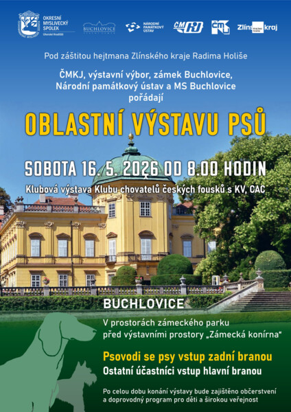 Dne 16. 5. 2026 se v areálu Státního zámku Buchlovice bude konat Oblastní výstava psů. Během konání této akce bude vstupné do parku jednotné 140 Kč a děti do 15 let věku zdarma. Vstupné do parku nebude zahrnuto do ceny vstupného na prohlídku zámku. Vstupné na prohlídku zámku bude navýšeno o vstupné na tuto akci. Bez zaplacení vstupného do parku nebude možné zakoupit vstupné na prohlídku zámku. Vstupné bude možné zakoupit výhradně na pokladně zámku u hlavního vstupu, pouze doprovod vystavovaných psů bude do areálu vstupovat branou z ulice Hradišťská.